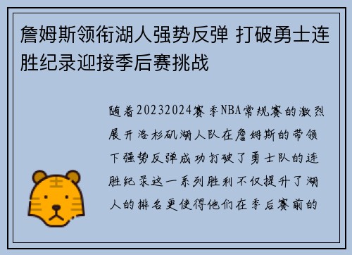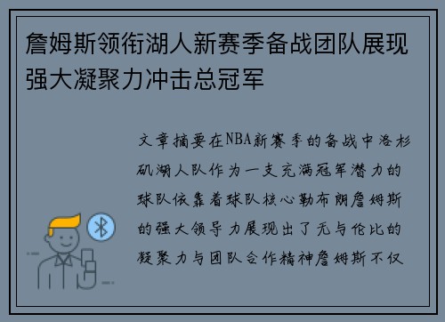 文章摘要:在NBA新赛季的备战中,洛杉矶...