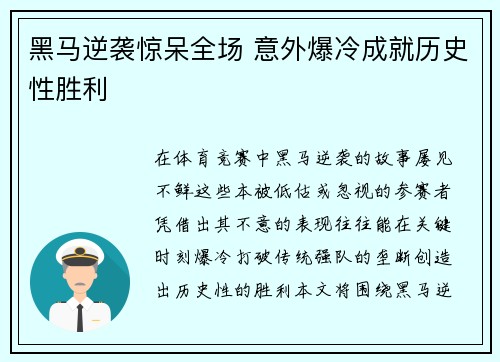 在体育竞赛中,黑马逆袭的故事屡见不鲜。这...