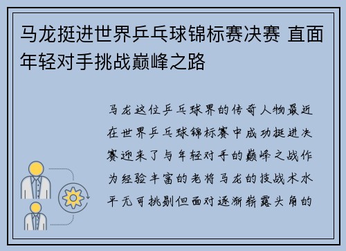 马龙,这位乒乓球界的传奇人物,最近在世界...