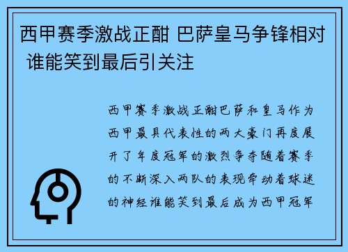 西甲赛季激战正酣,巴萨和皇马作为西甲最具...