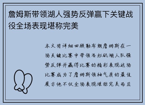 本文将详细回顾勒布朗·詹姆斯在一场关键比...