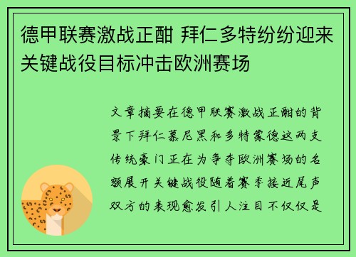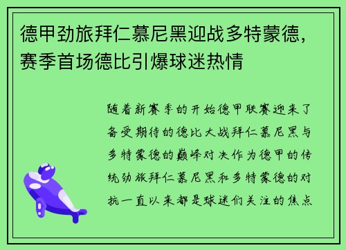 文章摘要:在德甲联赛激战正酣的背景下,拜...