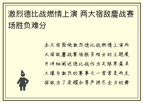 本文将围绕“激烈德比战燃情上演,两大宿敌...