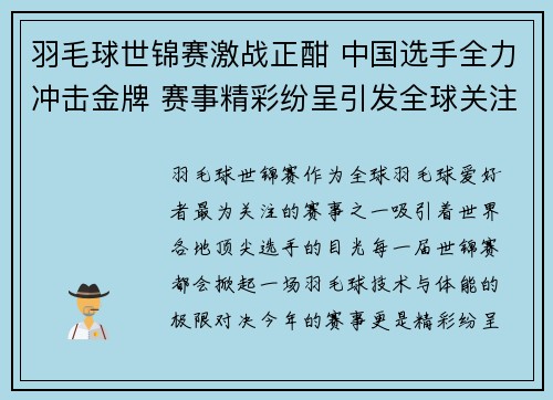 羽毛球世锦赛作为全球羽毛球爱好者最为关注...