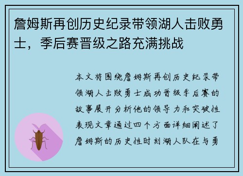 本文将围绕詹姆斯再创历史纪录,带领湖人击...