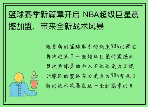 随着新的篮球赛季的到来,NBA的舞台再次...