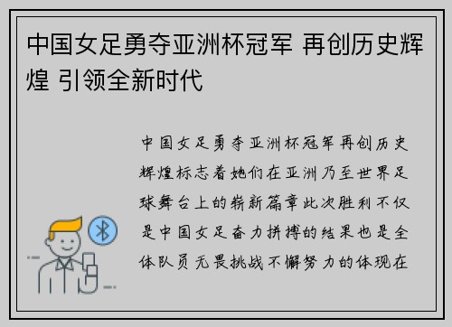 中国女足勇夺亚洲杯冠军,再创历史辉煌,标...