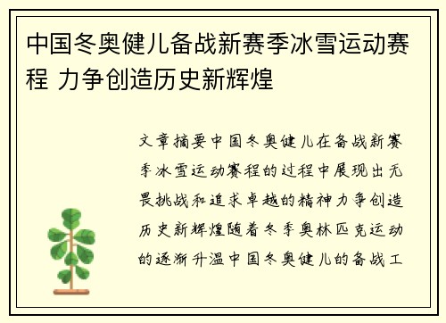 文章摘要:中国冬奥健儿在备战新赛季冰雪运...