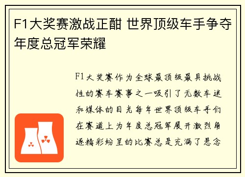 F1大奖赛作为全球最顶级、最具挑战性的赛...