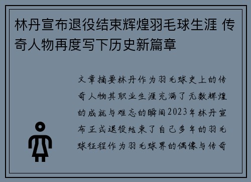 文章摘要:林丹,作为羽毛球史上的传奇人物...