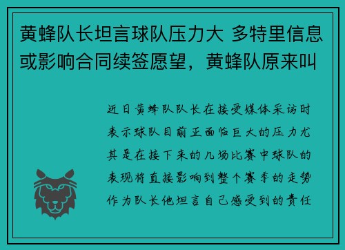 近日,黄蜂队队长在接受媒体采访时表示,球...