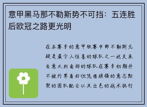 在本赛季的意甲联赛中,那不勒斯无疑是最令...